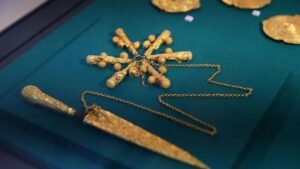 The display also showcases additional artefacts, including seven sheet-gold ornaments, a silver straining spoon, a pair of silver anklets, and one section of sheet-gold ornament. These items were among those taken during the wars and have now been restored to their place of origin. The Asantehene remarked ‘the return of these artefacts signifies the return of the Asante Spirit.